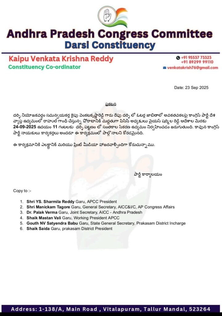 ఓట్ల చోరీపై దర్శిలో సంతకాల సేకరణ ఉద్యమం: కాంగ్రెస్‌ నేత కైపు